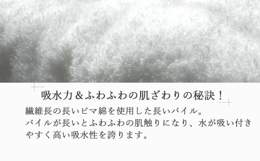 「MEZAMEシリーズ」は、アメリカのカリフォルニア州サンホーキンバレーで栽培された繊維長の長いピマ綿を使用しており、長いパイルがふわふわの肌触りと高い吸水性を誇ります。