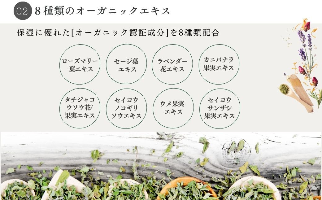原材料:水、グリセリン、DPG、リンゴ果実培養細胞エキス、ヒアルロン酸Na、ローズマリー葉エキス、セージ葉エキス、ラベンダー花エキス、セイヨウサンザシ果実エキス、タチジャコウソウ花ノ葉エキス、セイヨウノコギリソウエキス、カニナバラ果実エキス、ウメ果実エキス、BG、レシチン、フォリオタミクロスボラ多糖体、ポリクオタニウム-51、グリチルリチン酸2K、PEG-60水添ヒマシ油、クエン酸、クエン酸Na、キサンタンガム、ヒドロキシアセトフェノン、フェノキシエタノール、香料