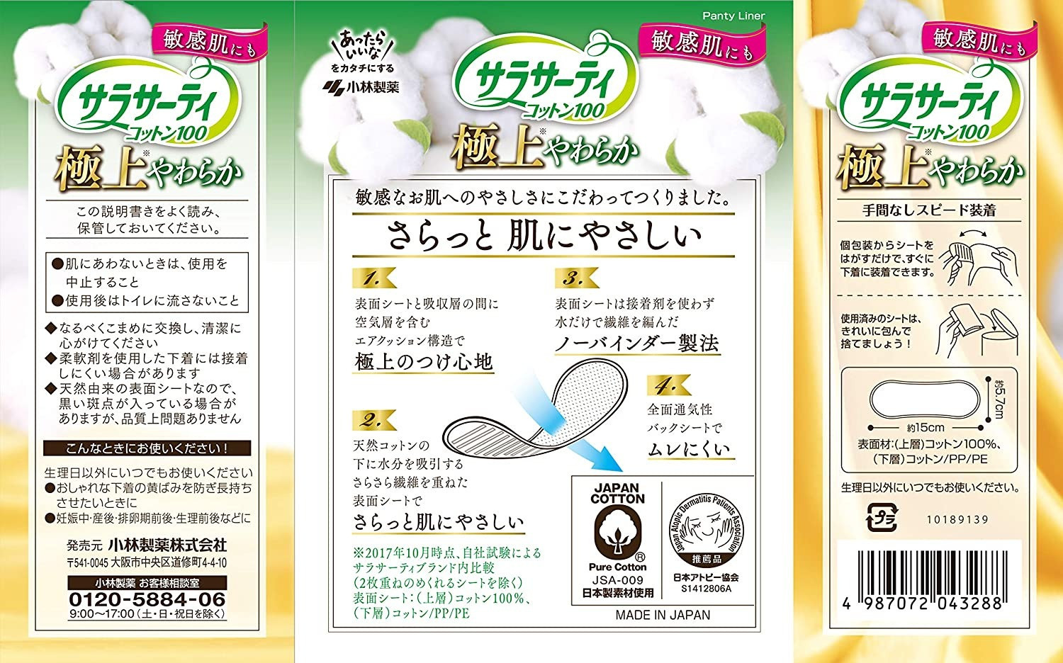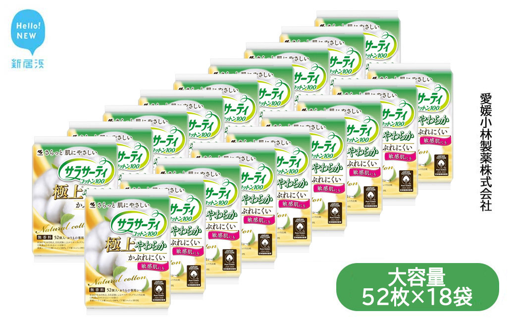 生活必需品の生理用品(衛生用品)おりものシートは女性に優しい人気の国産をおすすめ 大容量 サラサーティコットン100 極上やわらか 52個×18袋セット(無香料) 天然コットン100% 生理用品【愛媛小林製薬】