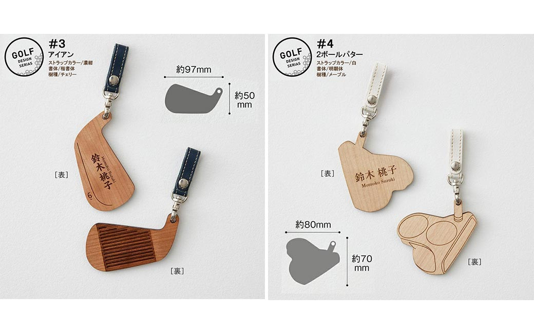 | 容量 | 【ゴルフネームプレート ※本革ストラップ付】 ・ゴルフネームプレート 1 ・本革ストラップ 1 □デザイン(ストラップカラー・書体・樹種): #1:クラシックドライバー(黒・ゴシック体・チェリー) #2:クラシックパター(深緑・明朝体・チェリー) #3:アイアン(濃紺・楷書体・チェリー) #4:2ボールパター(白・明朝体・メープル) #5:マレット型パター(茶・ゴシック体・メープル) #6:ピン型パター(白・ゴシック体・メープル) #7:ボール&ティー(黒・明朝体・メープル) ※7種類からいずれか1点をお選びください。 ※デザインごとにストラップカラー・書体・樹種は決まっております。 ーーーーーーーーーーーーーーーーーーーー □サイズ: <プレート部> 厚さ5mm ※縦×横はデザインにより異なります。(画像参照) <ストラップ> 長さ約75mm×幅約12mm 【備考】キーホルダータイプ金具 ※長さはジョイント部を含む □素材: <本体(木部)> 【樹種】チェリー・メープル ※デザインにより異なります。 <ストラップ> 金具・牛革(カーフレザー) ※国内工場で製造 |