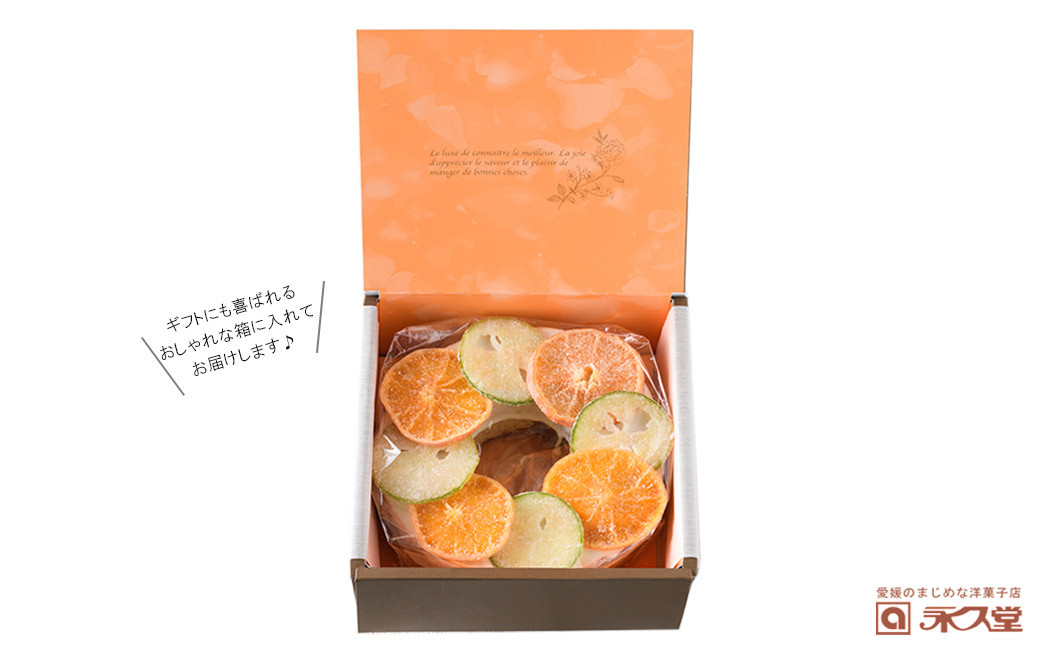 柑橘王国愛媛県のセミドライフルーツをおしゃれにトッピングした特製バウムクーヘン 永久堂 セミドライフルーツ バウムクーヘン 紅まどんな 青いレモン 瀬戸内 柑橘 柑橘王国愛媛