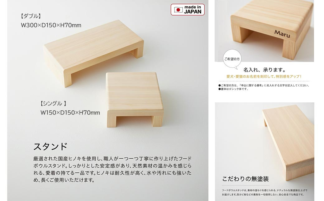 国産ヒノキを使い、熟練職人の手で丁寧に作られた天然素材の木製「フードボウルスタンド」と、食べやすさを追求して作られた「フードボウル」をセットにしました。食べやすく体に負担をかけにくい食事環境で、大切な愛猫・愛犬の食事時間をより快適にし、優しく健康をサポートします。
