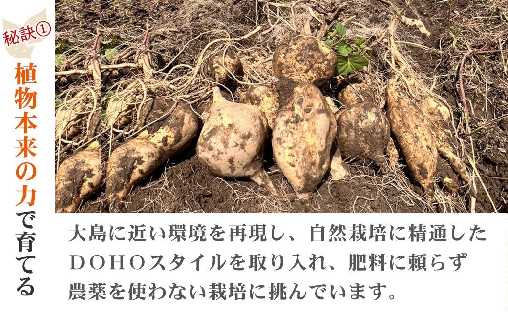 大島の段々畑という過酷な自然環境で育ち、その地でしか出せないとされる、濃厚でしっとりとした甘みが特徴。