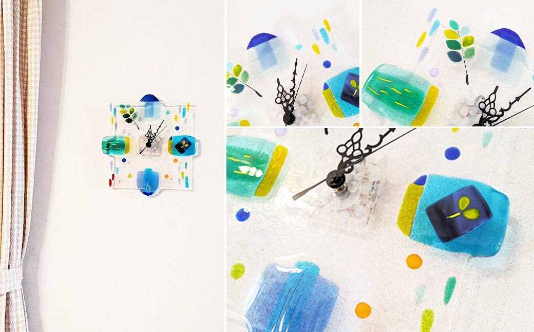 ガラスフュージングという技法により高温で融合させて一つ一つ手作りした透明な掛時計