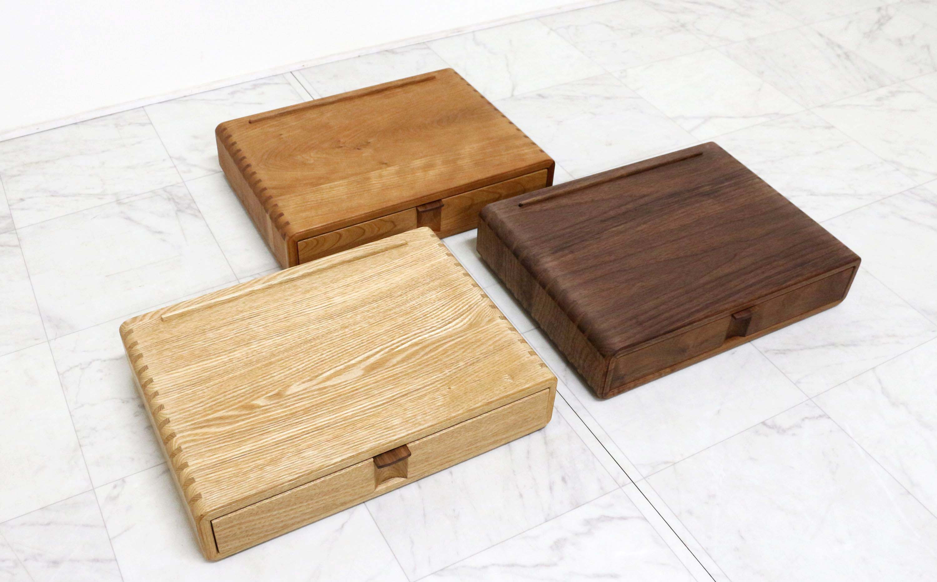 素材はウォールナット・タモ・ブラックチェリーの3種類で、各1個ずつとなります。