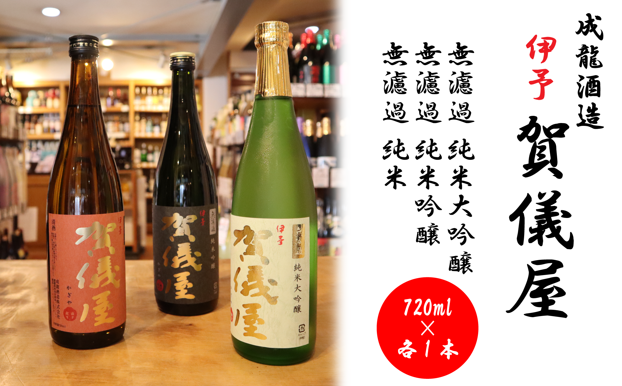 | 容量 | 「伊予賀儀屋」純米大吟醸 グリーンラベル720ml×1本 「伊予賀儀屋」純米吟醸 黒ラベル720ml×1本 「伊予賀儀屋」純米無濾過 赤ラベル720ml×1本 |