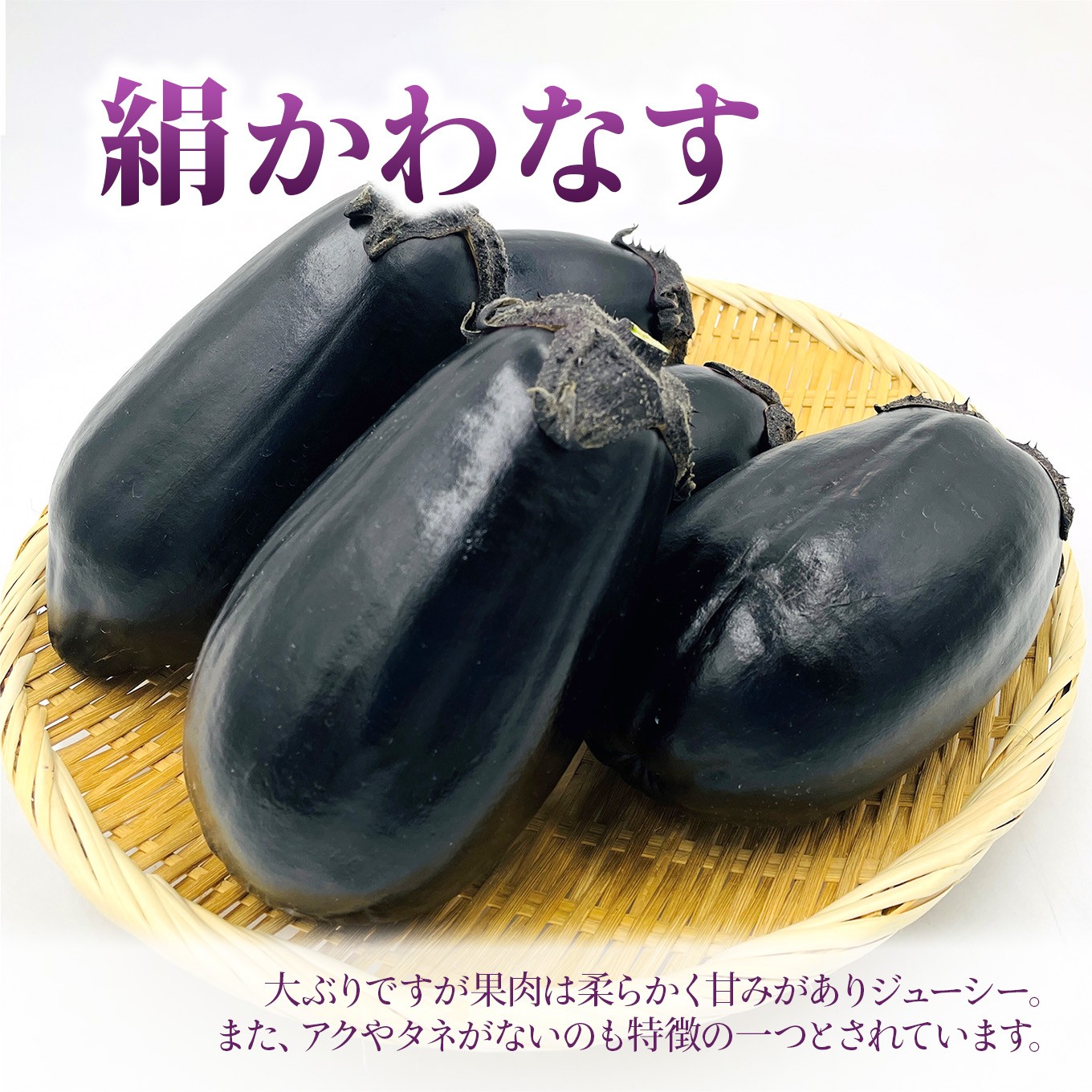 やわらかでなめらかな絹かわなすをぜひいろいろな調理法でお楽しみください。