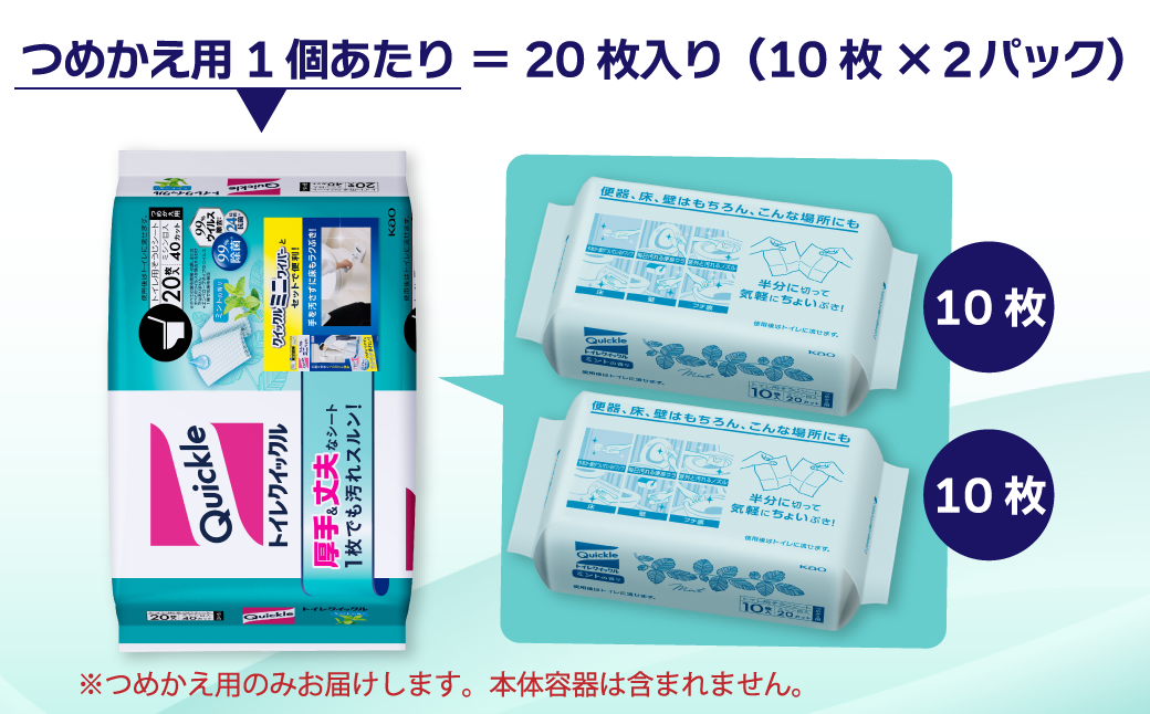 ※乾燥を防ぎ、品質を保持するため、必ず「トイレクイックル ミントの香り」の本体容器につめかえてお使いください。