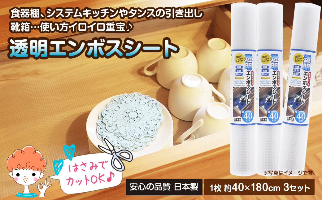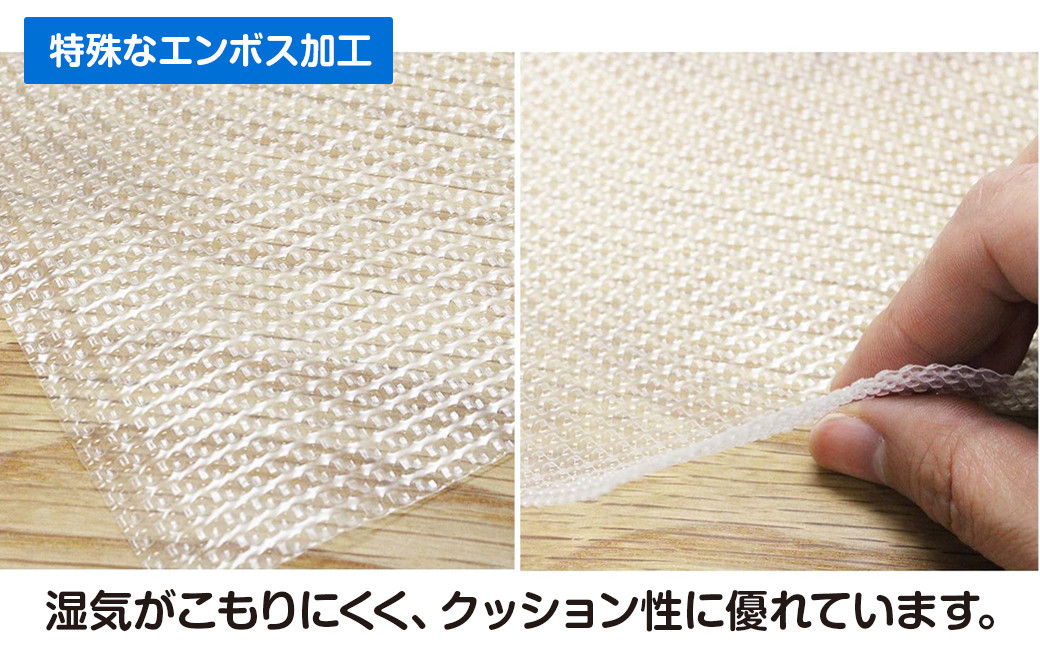 ●表面に特殊なエンボス加工をしたシートです。湿気がこもりにくく、クッション性に優れています。 ●消臭・抗菌・防カビ成分配合のため、清潔に収納して頂けます。 ●はさみでカットできます。また透明なのでどんな棚でもよく合います。 ●食器棚、システムキッチンやタンスの引き出し、靴箱・・・使い方イロイロ重宝します。 ●安心の品質、日本製です。 【注意事項】 ●火のそばに置かないでください。 ●湿気の多い場所では長期間シートを敷いたままにせず、敷き変えてください 。
