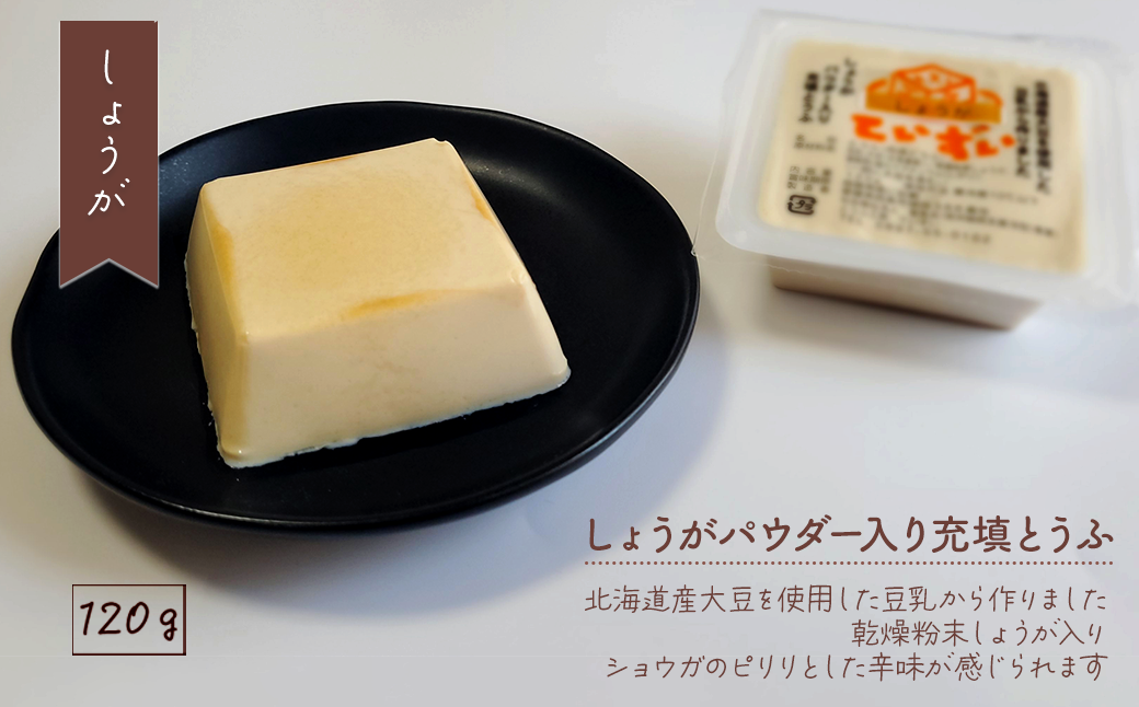 | 容量 | 【お豆腐セット】 ・プレーン充填豆腐 120g×3個 ・ほうれんそうパウダー入り充填豆腐 120g×3個 ・しょうがパウダー入り充填豆腐 120g×3個 |