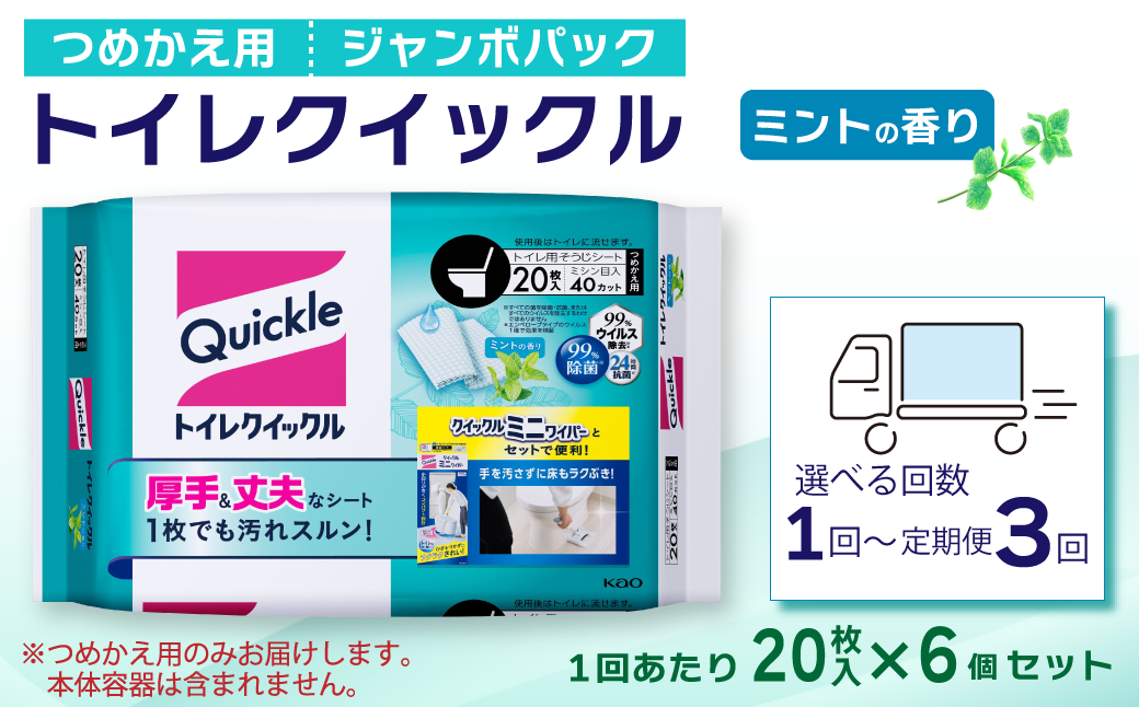 1枚でトイレまるごときれいに!トイレ掃除に大活躍! 【選べる配送回数(1~3回)】トイレクイックル つめかえ用 ジャンボパック (20枚入×6個セット) 愛媛県西条市 | トイレ クイックル 掃除用品 掃除 日用品 拭き掃除 トイレ掃除 流せるシート 除菌 消臭 西条市 送料無料
