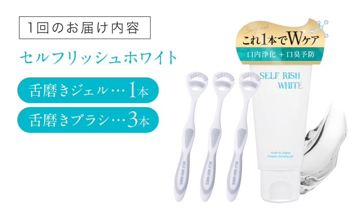 日用品 歯磨き粉 歯ブラシ 舌磨き ホワイトニング 歯周病 ジェル 口臭ケア 【全3回定期便】 セルフリッシュホワイト 舌磨きジェル ミントフレーバー風味 1本(100g) & 舌磨きブラシ 3本 愛媛県大洲市/Gross Mountain合同会社 歯磨き粉 歯ブラシ 舌磨き ホワイトニング 歯周病 ジェル 口臭予防 オーラルケア [AGCQ060]