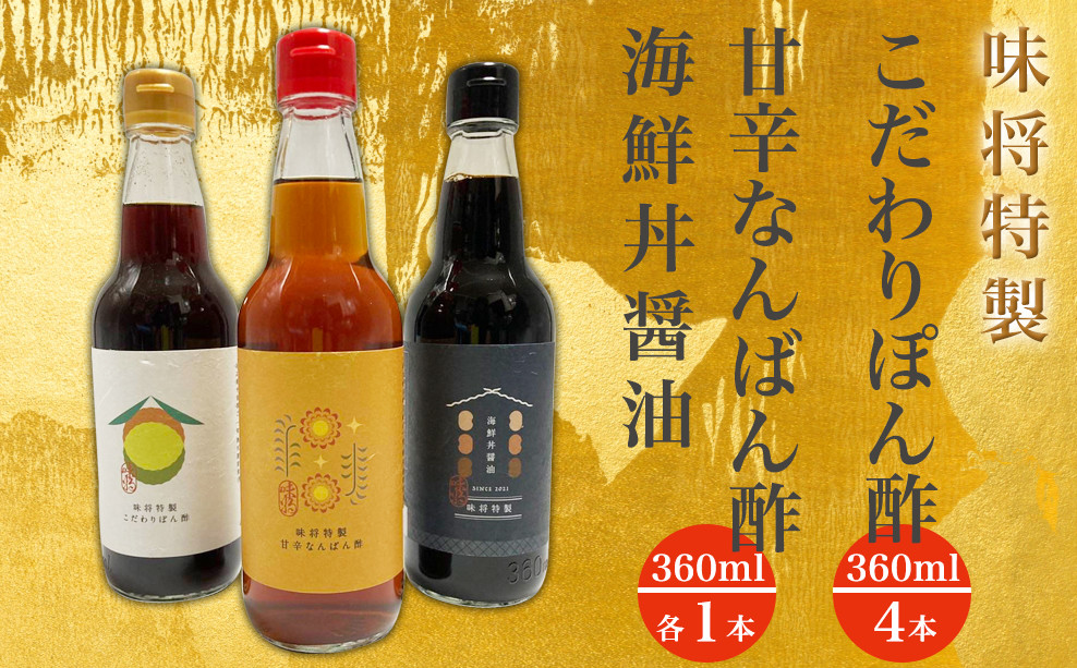 | 容量 | こだわりぽん酢 360ml×4本 甘辛なんばん酢 360ml×1本 海鮮丼醤油 360ml×1本 |