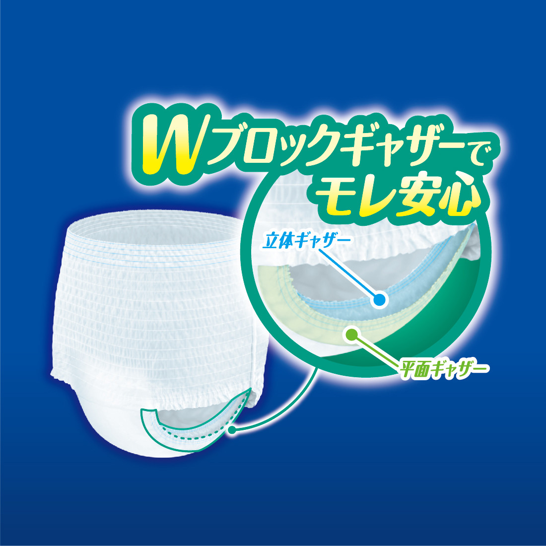 ●脚まわりのWギャザーがぴったりフィットして、就寝時の脚まわりモレをブロック。