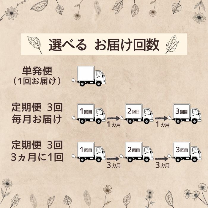 <単発便> お届け日のご指定を受け付けています。お申し込み時にご希望のお届け日をお選びください。 ※日付指定が無い場合は、お届けまで最短1週間~最大2ヶ月程度かかります。 ※寄附後、日付指定無しから有りへの変更、指定した日付の変更は承れません。 ※オフライン決済の場合は日付指定無しと同様、決済完了確認後お届けまで最短1週間~最大2ヶ月程度かかります。 ※配送エリアや天候状況により、ご指定日にお届けできない場合もございますので予めご了承ください。 ※備考欄に記載があると配送が遅れる場合がございます。 <定期便> 【3ヶ月毎月定期便】寄附納入確認後、初回を1ヶ月以内に発送します。(以降1ヶ月に1回、計3回の定期便です) 【定期便3回 3ヶ月毎】寄附納入確認後、初回を1ヶ月以内に発送します。(以降3ヶ月に1回、計3回の定期便です) |