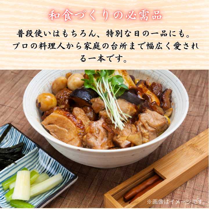 素材の味を包み込むようなやさしい甘さ。煮物、照り焼き、丼ものなど、和食の基本をしっかり支えます。