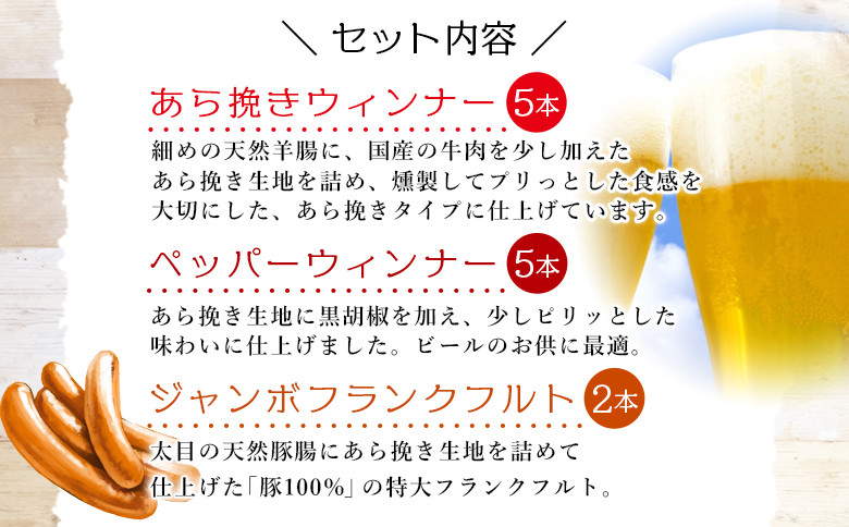 | 容量 | 【あら挽きウインナー】5本 【ペッパーウインナー】5本 【ジャンボフランクフルト】2本 【あら挽ミニウインナー】10本 【ボイルドあら挽きウインナー】5本 【旨辛チョリソー】5本 |