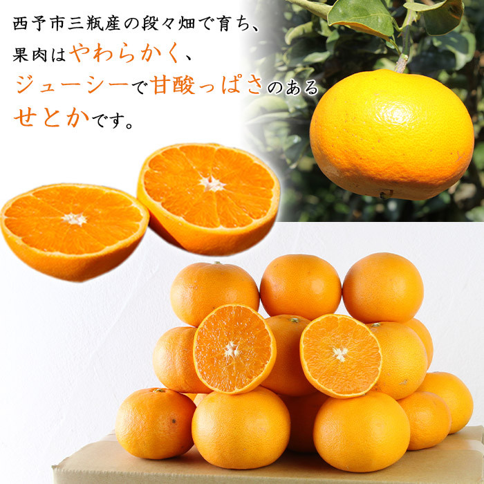 愛媛県西予市三瓶産の段々畑で育ち、果肉は柔らかく、ジューシーで甘酸っぱさのあるせとかです。