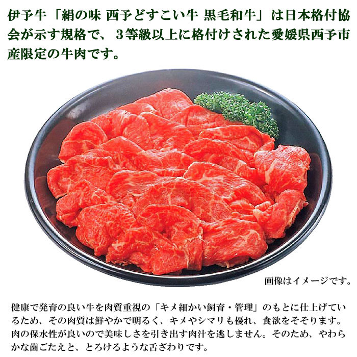 伊予牛「絹の味 西予どすこい牛 黒毛和牛」は日本格付協会が示す規格で、3等級以上に格付けされた愛媛県西予市産限定の牛肉です。