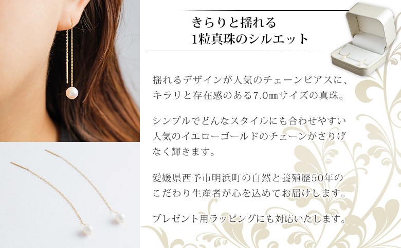 揺れるデザインが人気のチェーンピアスに、キラリと存在感のある7.0㎜サイズの真珠。