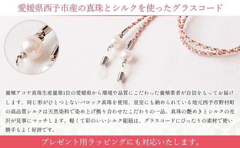 愛媛県西予市産の真珠とシルクを使ったグラスコードです。