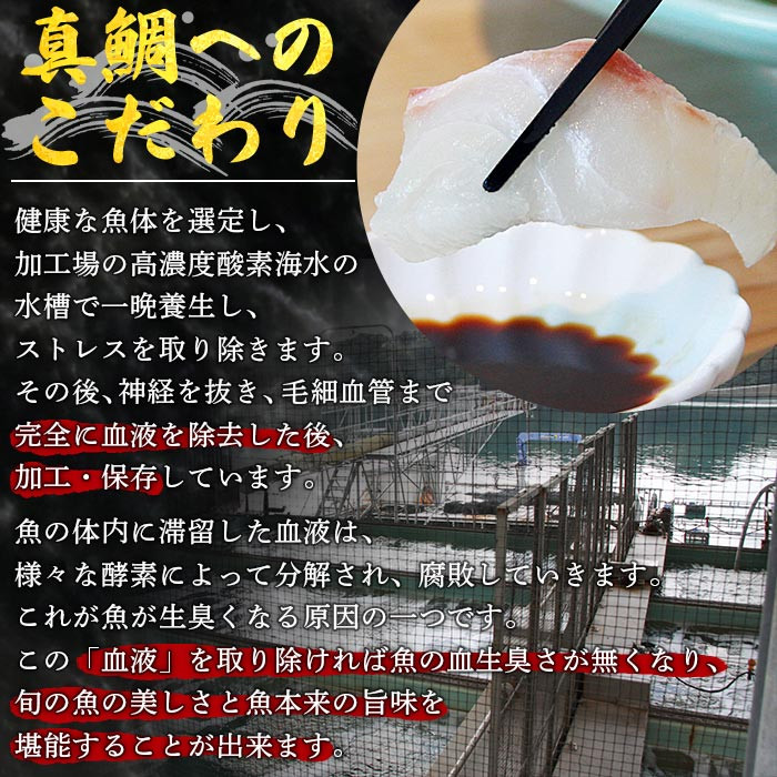 特許製法「超冷薫」で魚の毛細血管まで完全に血を取り除いた「驚きの真鯛」をご堪能下さい。魚の血生臭さが無くなり旬の魚の「美しさ」と「本来の旨味」が味わえます。今まで経験したことのない真鯛の美味しさを味わっていただけます。健康な魚体を漁場出荷場で選定し、一晩高濃度酸素海水中で養生し、ストレスを取り除きます。その後、毛細血管まで完全に血液を除去した後、加工・保存しています。魚の体内に滞留した血液は、様々な酵素によって分解され、腐敗していきます。これが魚が生臭くなる原因の一つです。この「血液」を取り除ければ魚の血生臭さが無くなり、旬の魚の美しさと魚本来の旨味を堪能することが出来ます。ご飯と一緒に炊き込む鯛めしや、さしみの状態で汁と絡めるタイプの鯛めしなど新鮮でないと出来ないメニューも作ることが出来ます。焼き魚でも天ぷらでもお刺身でも鯛本来の食感と旨味をお楽しみ頂けます。個包装で真空パックしているので、必要な時に必要な分だけ解凍してお使い頂けます。