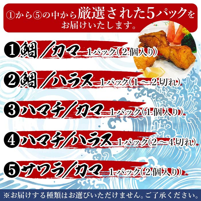 | 容量 | ・タイ カマ 1パック(2個入り) ・タイ ハラス 1パック(1~2切れ) ・ハマチ カマ 1パック(1個入り) ・ハマチ ハラス 1パック(2~4切れ) ・サワラ カマ 1パック(2個入り) この中から厳選5パック入り |
