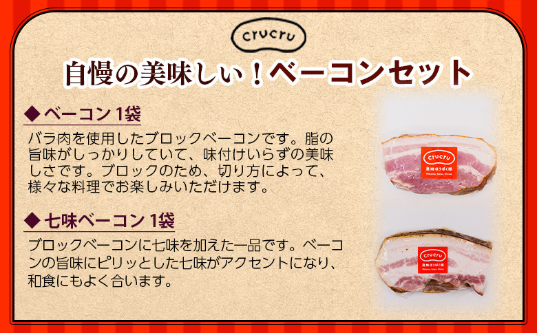 crucru自慢の美味しいベーコン2種とウインナーのセットです <奥地ほうぼく豚を使ったベーコンセット>豚肉 ぶた お肉 加工品 おつまみ おかず ベーコン 七味ベーコン ボイルウインナー バラ肉 ブロック 詰合せ BBQ アウトドア キャンプ サラダ 愛媛県 西予市 【冷蔵】『4か月以内に順次出荷予定』