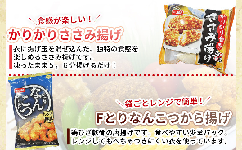 | 容量 | ■甘辛ダレのささみフライ:720g ■こつぶメンチカツ:400g ■かりかりささみ揚げ:400g×2 ■Fとりなんこつから揚げ(レンジ調理):90g |