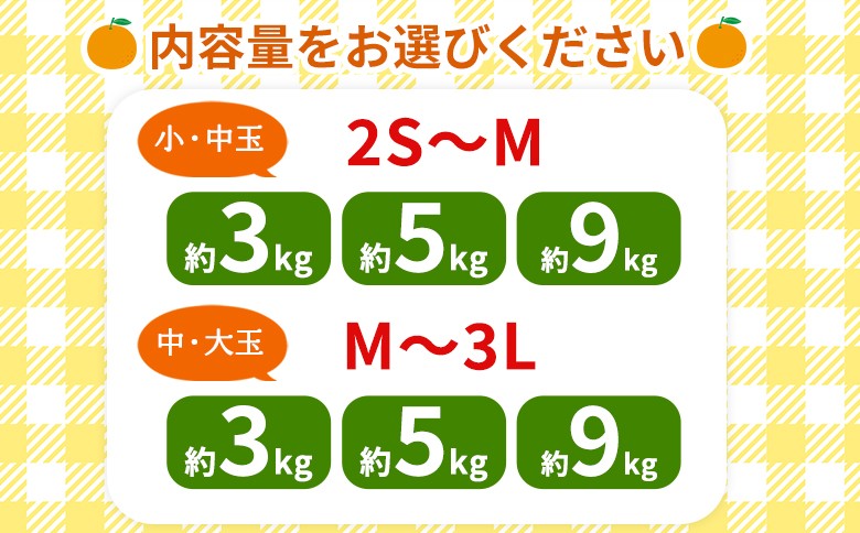 | 容量 | 【温州みかん 訳あり】 ※以下からお選びください ・約3kg/約5kg/約9kg(小・中玉 2S~M) ・約3kg/約5kg/約9kg(中・大玉 M~3L) ※3kgは5kg箱に詰めてお送りいたします。 |