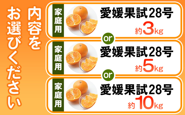 | 容量 | 【愛媛果試28号 ご家庭用】 ※内容量をお選びください 約3kg 《寄附金額:15,000円》 約5kg 《寄附金額:20,000円》 約10kg 《寄附金額:38,000円》 |