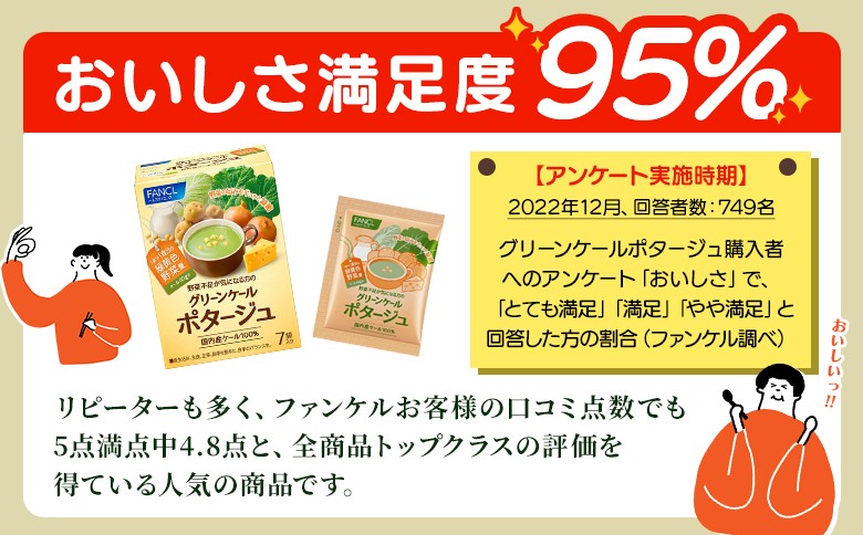 「グリーンケールポタージュ」では、1杯で1食分の緑黄色野菜量(ケール生葉40g使用)を使用しています。