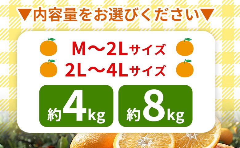 | 容量 | 【伊予柑】 ▼サイズをお選びください▼ 小・中玉(M~2L) 中・大玉(2L~4L) ▼数量をお選びください▼ 約4kg / 8kg |