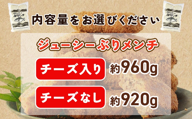 | 容量 | ▼お選びください▼ ・ぶりメンチ チーズ入り 10個 約960g《寄附金額:13,000円》 ・ぶりメンチ チーズなし 10個 約920g《寄附金額:11,000円》 |