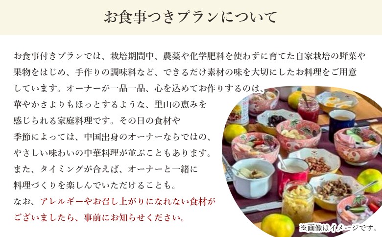 お食事付きプランでは、栽培期間中農薬・化学肥料を使っていない自家栽培野菜や果物、手作りの調味料など、