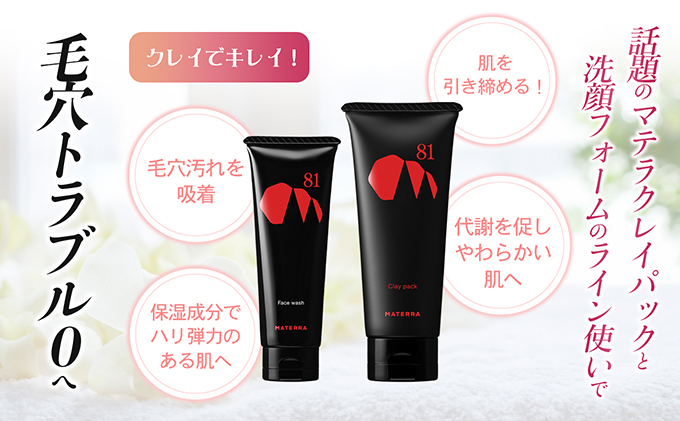| 容量 | 洗顔フォーム ・内容量 120g 【商品説明】 植物由来のせっけんからなるやさしい洗顔フォーム こだわった9種類の保湿美容成分配合*1で、透明感のある柔らかい肌へ整える洗顔石鹸です。 マテラパウダーと細かい濃密なクッション泡が必要なうるおいをきちんと残すから、洗顔後もつっぱらず、くすみのない1トーン明るい肌へと導きます。 また、マスクによるニキビ*2にも最適です。 *1 水溶性プロテオグリカン、プラセンタエキス、ローヤルゼリー他 *2 洗浄によりニキビを防ぐ ・付属品 泡立てネット×1個 ・全成分 水、ミリスチン酸、BG、グリセリン、水酸化K、ステアリン酸、ステアリン酸グリセリル、ラウラミドDEA、流紋岩末、パルミチン酸、ポリクオタニウム-7、ステアロイルグルタミン酸Na、ココイルメチルタウリンNa、リンゴ果実培養細胞エキス、カンゾウ根エキス、加水分解コンキオリン、フェノキシエタノール、水溶性プロテオグリカン、ローヤルゼリーエキス、加水分解コラーゲン、キサンタンガム、プラセンタエキス、ハトムギ種子エキス、クズ根エキス、レシチン クレイパック ・内容量 180g 【商品説明】 81洗顔フォームと共通である9種類の保湿美容成分*1を配合し、美容成分を重ねて使用することで、パックを洗い流した後はしっとりした潤いを保ち、突っ張らず、すべすべのお肌に導きます。 また、マスクによるニキビ*2にも最適です。 *1 水溶性プロテオグリカン、プラセンタエキス、ローヤルゼリー他 *2 洗浄によりニキビを防ぐ ・全成分 水、カオリン、BG、グリセリン、ベントナイト、ペンチレングリコール、酸化チタン、ジグリセリン、トリイソステアリン酸ポリグリセリル-2、エタノール、流紋岩末、シクロヘキサン-1,4-ジカルボン酸ビスエトキシジグリコール、フェノキシエタノール、キサンタンガム、ヒアルロン酸ヒドロキシプロピルトリモニウム、スクワラン、リンゴ果実培養細胞エキス、カンゾウ根エキス、ザクロ果実エキス、加水分解コンキオリン、水溶性プロテオグリカン、ローヤルゼリーエキス、加水分解コラーゲン、プラセンタエキス、ハトムギ種子エキス、クズ根エキス、レシチン、セイヨウオオバコ種子エキス |