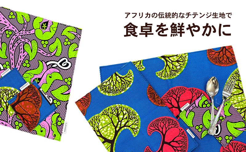 アフリカの伝統的なチテンジ生地を使った他には見られない商品で、お部屋のインテリアにもピッタリです。コースターとランチョンマットのセットとなっており、食卓を鮮やかに彩ってくれること間違いなしです。コースターもランチョンマットもリバーシブルの為、気分によってご使用いただけます。プレゼントにもピッタリなので、ぜひ手に取ってみてください。