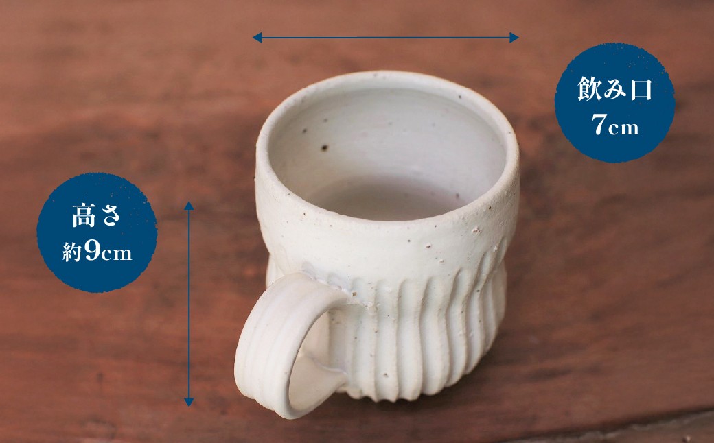 | 容量 | コーヒーカップ 1個 サイズ:約9cm(高さ)×7cm(飲み口) 内容量:300ml 重さ:200g 製造地:愛媛県上島町 ■原材料・成分 陶土 |