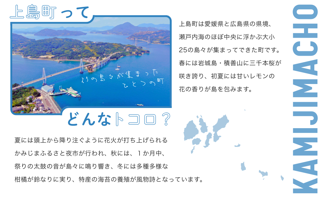 上島町は、愛媛県の東北部、広島県との県境に位置し、瀬戸内海のほぼ中央に浮かぶ25の離島からなる町です。