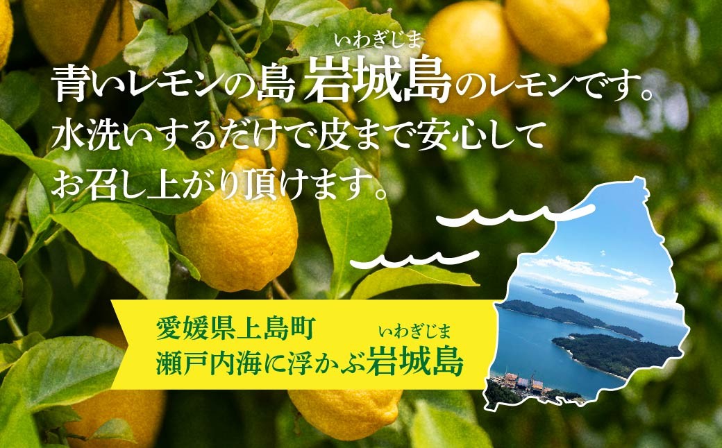 青いレモンの島岩城島で栽培されたレモンです。S~2Lサイズのいずれかが入ります。