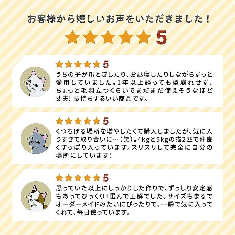 おかげさまで皆様から嬉しいお言葉を頂くことも増えました。贈り物として、また、猫ちぐらをご愛用の方からは、寝床兼籠の注文を頂くなどリピーターさんも増え、モチベーションにも繋がります。