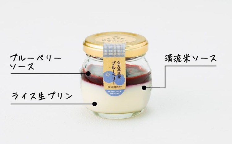 ブルーベリープリン/米(久万高原町産)、牛乳、生クリーム、砂糖、ブルーベリー、還元水飴、卵、寒天、塩、レモン果汁/トレハロース、ゲル化剤(増粘多糖類)、乳化剤(一部に乳成分・卵を含む)