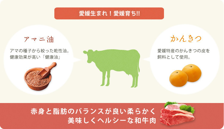 愛媛県内の指定農家が、「愛媛あかね和牛飼料給与マニュアル」に基づき、細やかな管理のもとで丹精込めて育てています。特産のかんきつを使った独自の飼料が、ヘルシーで豊かな風味を生み出します。