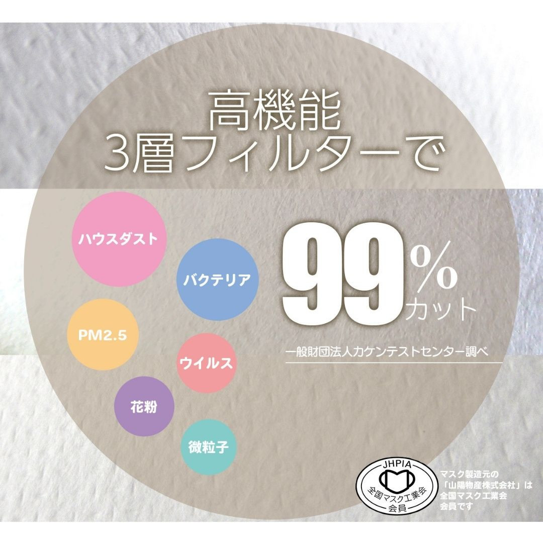 不織布3層フィルターを立体プリーツ加工し、鼻にフィットするノーズワイヤーとソフトタイプの耳掛け紐で、息苦しさを抑えた優しい着け心地とフィット感に仕上げています。