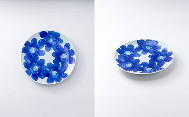 花や植物をモチーフにした淡い水彩画のような染付は、「和紙染め」という独自の手法によるもの。