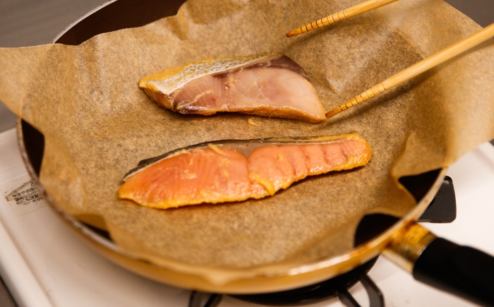 ・解凍後袋から取り出した後、切身にぬってある西京味噌をキッチンペーパーできれいに拭き取ります。