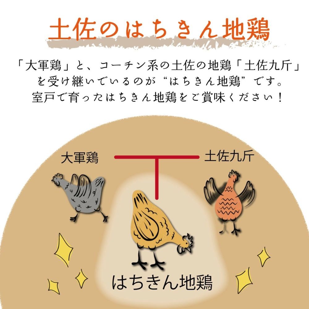 はちきん地鶏は、土佐九斤(コーチン)と大軍鶏(シャモ)の味を受け継ぐ高級地鶏。