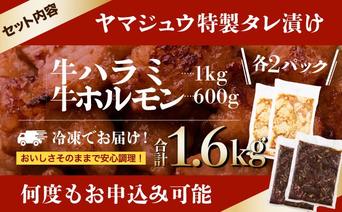 ヤマジュウの特選タレ漬け!牛ハラミ肉1kg&国産牛ホルモン600g