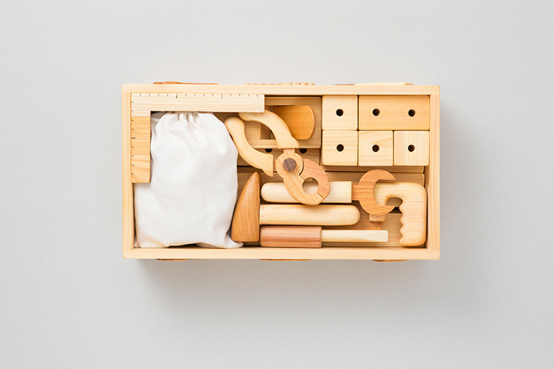トンカチ、ノコギリ、レンチにカンナ… 本物の大工さんも顔負け! 本格的な大工道具をそろえたセットです。