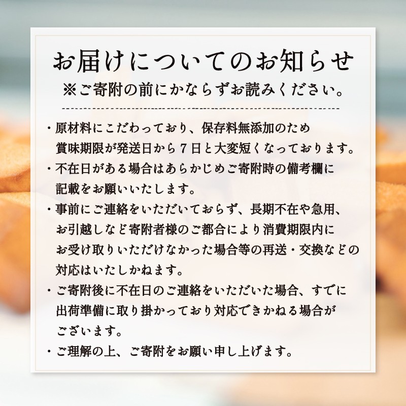 | 消費期限 | ◇賞味期限 7日間(お手元に届きましたら、常温26度以下での保管をお願いします) 原材料にこだわりを持って製造しており、保存料等の不要な添加物は使用しておりません。 そのため賞味期限は発送日から7日間と短いため、できたてのフィナンシェをお送りしております。 到着後できるだけ早くお召し上がりいただけますと幸いです。 |